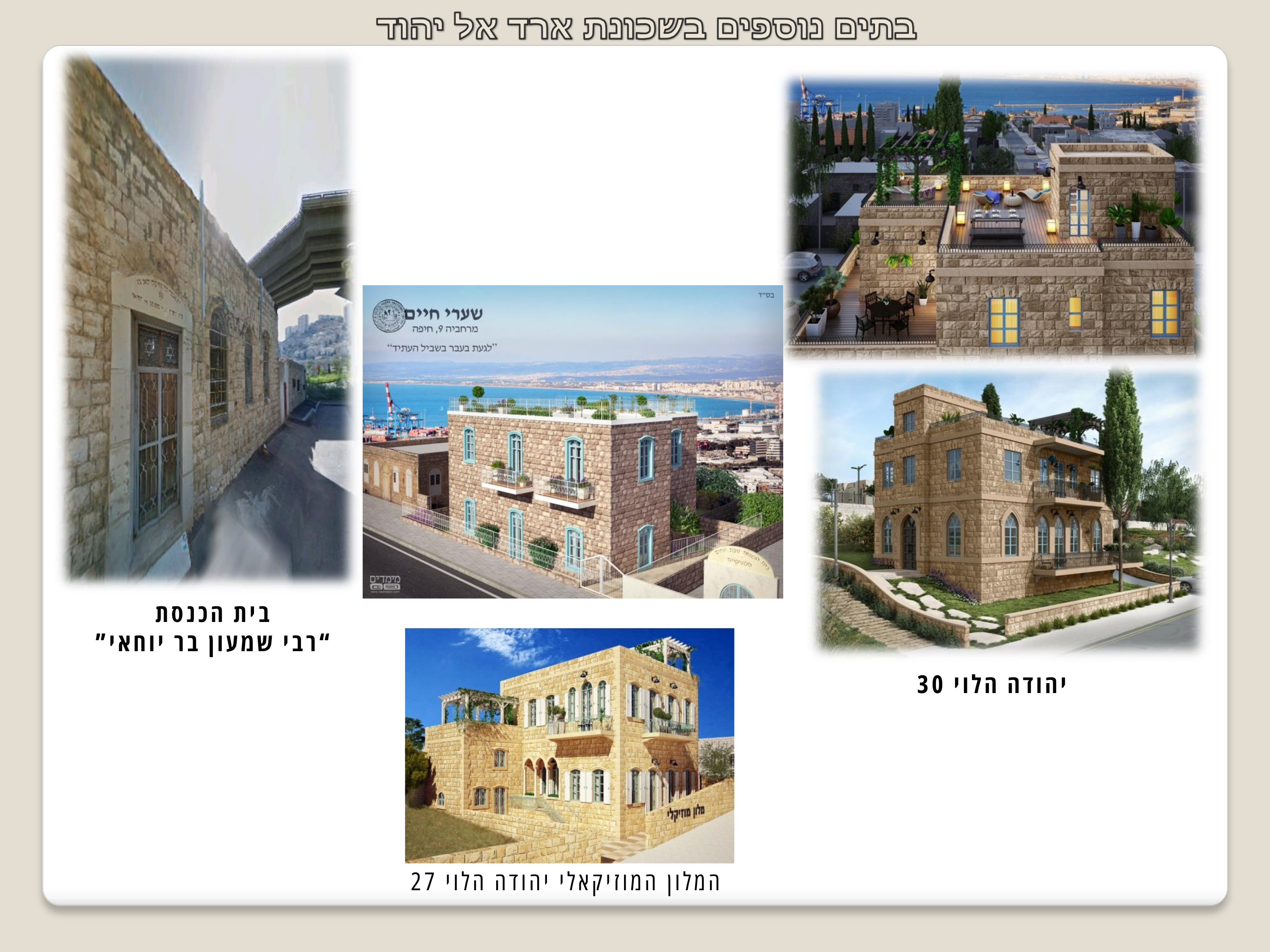 שכונת ארד אל יהוד הוקמה בתקופת ההתיישבות היהודית בחיפה. בתי הכנסת, החנויות הקטנות והשכנים שהכירו זה את זה, יצרו קהילה חמה ומזמינה. אמנם השכונה היום ריקה מאדם, אך דווקא בשל כך טמון בה פוטנציאל אדיר. השכונה נמצאת במיקום אידיאלי מבחינת נגישות, עם דרכי גישה נוחות ומדרגות המובילות מרחוב קיבוץ גלויות הראשי. זהו המקום המושלם להקמת מסעדות, ברים, גלריות, בתי ספר לבישול או לעיצוב, ואפילו מרכזי רפואה אלטרנטיבית. כל אלה יכולים להפוך את ארד אל יהוד למוקד משיכה מחודש ואטרקטיבי בחיפה.
